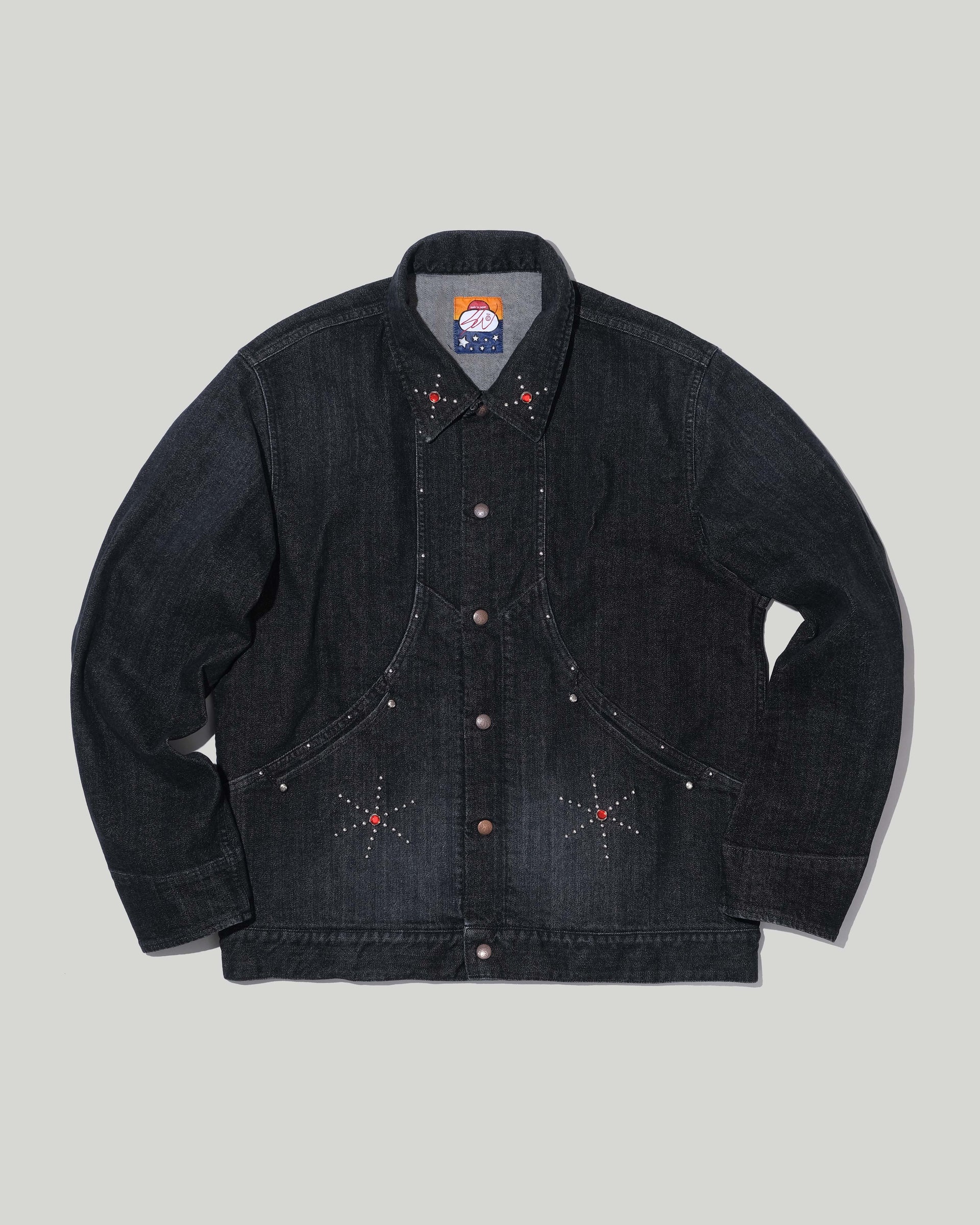 特徴的なスタッズが配された子供服のデザインをベースにした、遊び心のあるデニムジャケット。フロントの曲線的なラインが特徴的。カフはウエスタン仕様。軽めのオンスで通年着用が可能。フェード加工に加え、程よいペイント加工がアクセントに。