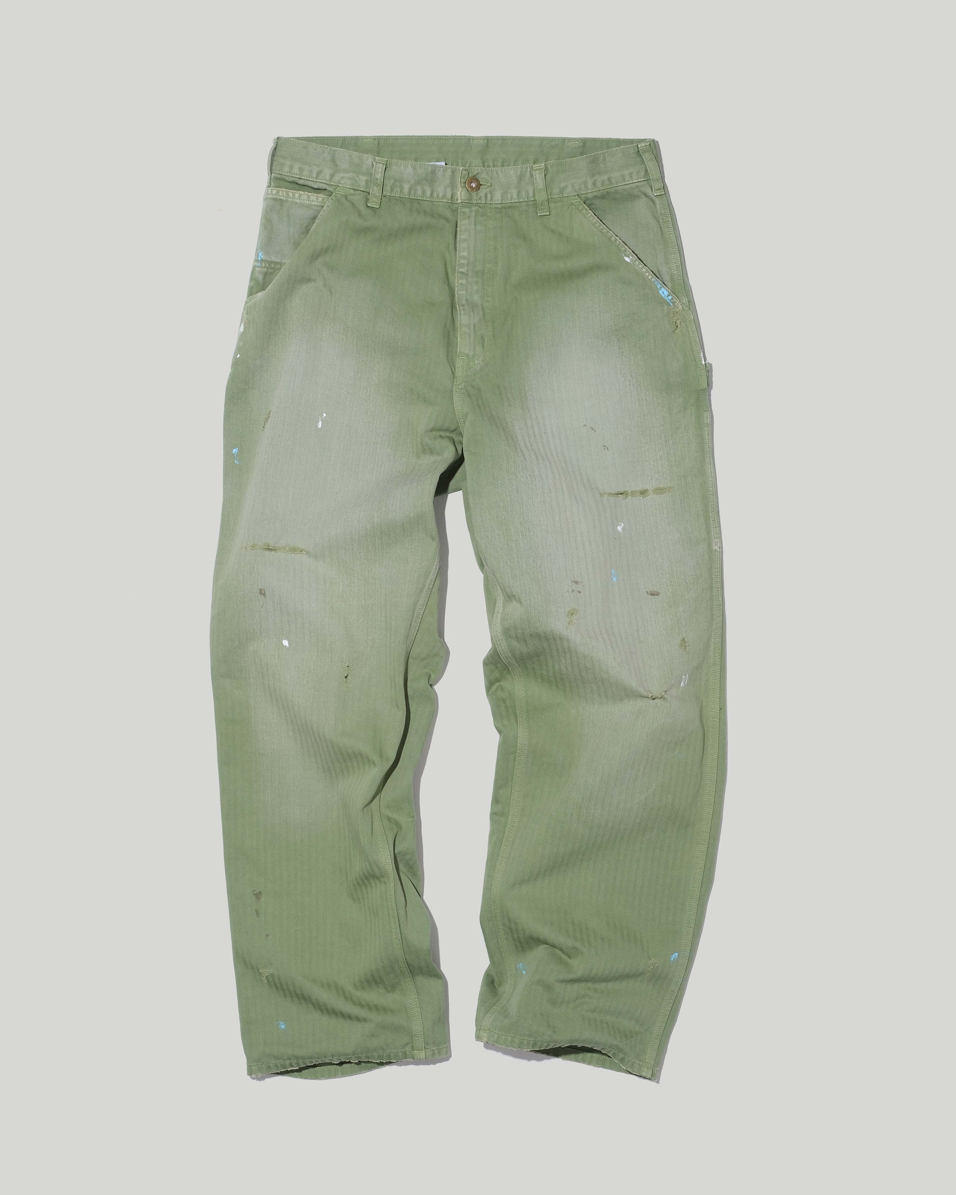 1950年代のアメリカのユニフォームのカーペンターパンツをベースに、程よいペインティングとダメージ加工を施した。ヘリンボーン生地の風合いと全体的なフェード感が特徴。オリジナルボタン。SWJP ATELIER SHIRTとセットアップで着用可能。